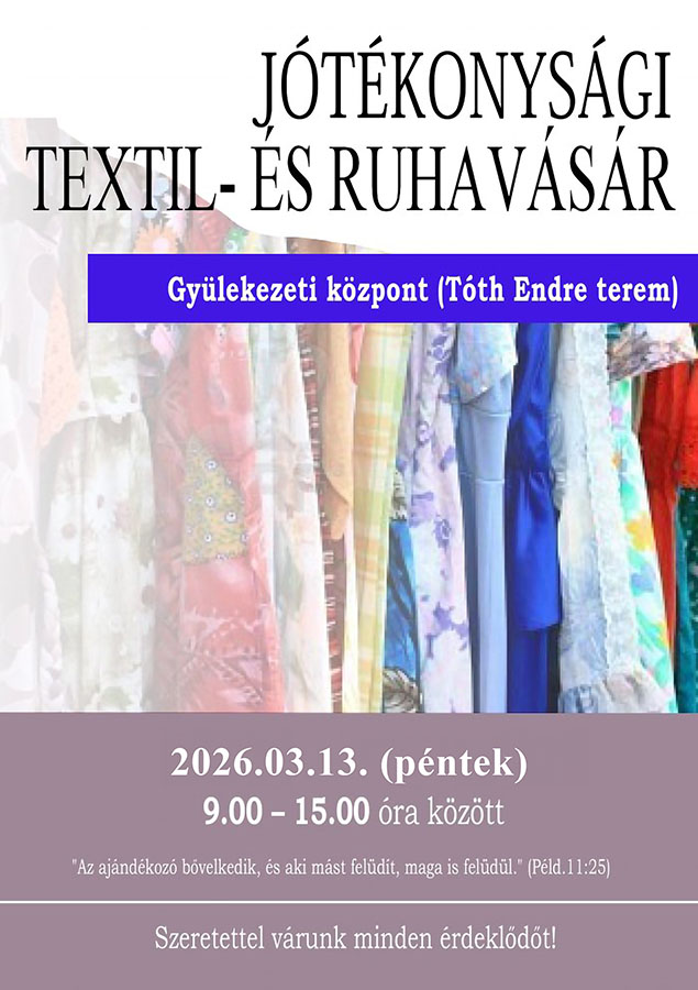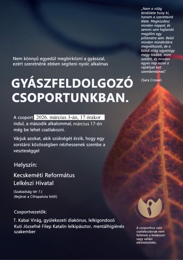 Helyszín: Kecskeméti Református Lelkészi Hivatal (Szabadság tér 7., bejárat a Cifrapalota felől).