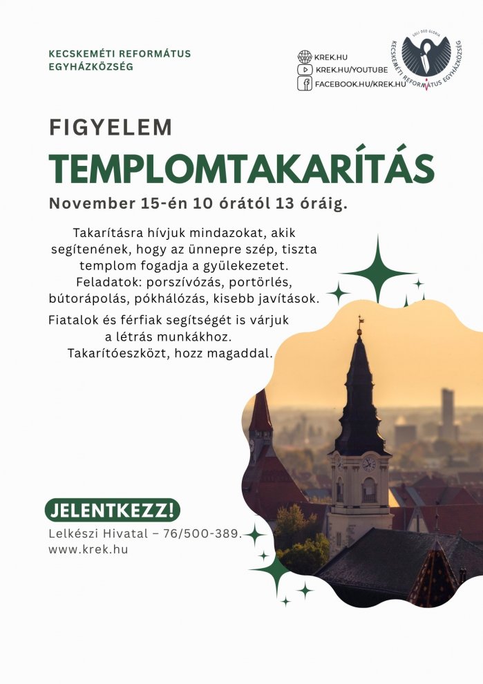 Takarításra hívjuk mindazokat, akik segítenének, hogy az ünnepre szép, tiszta templom fogadja a gyülekezetet.