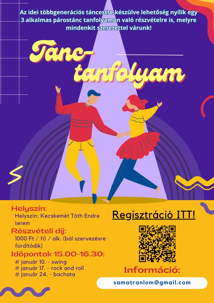 Készüljön velünk a 4. Többgenerációs Táncestre, amelyet 2026. január 31-én tartunk a kecskeméti Nagykonviktusban! A bált megelőzően háromalkalmas felkészítő tanfolyamot indítunk (január 10., 17., 24.), ahol swing, rock and roll és bachata alapokat tanulhatnak az érdeklődők. A részvételhez regisztráció szükséges, részletekért és jelentkezésért keressék Molnár Tamást a plakátokon található elérhetőségeken.