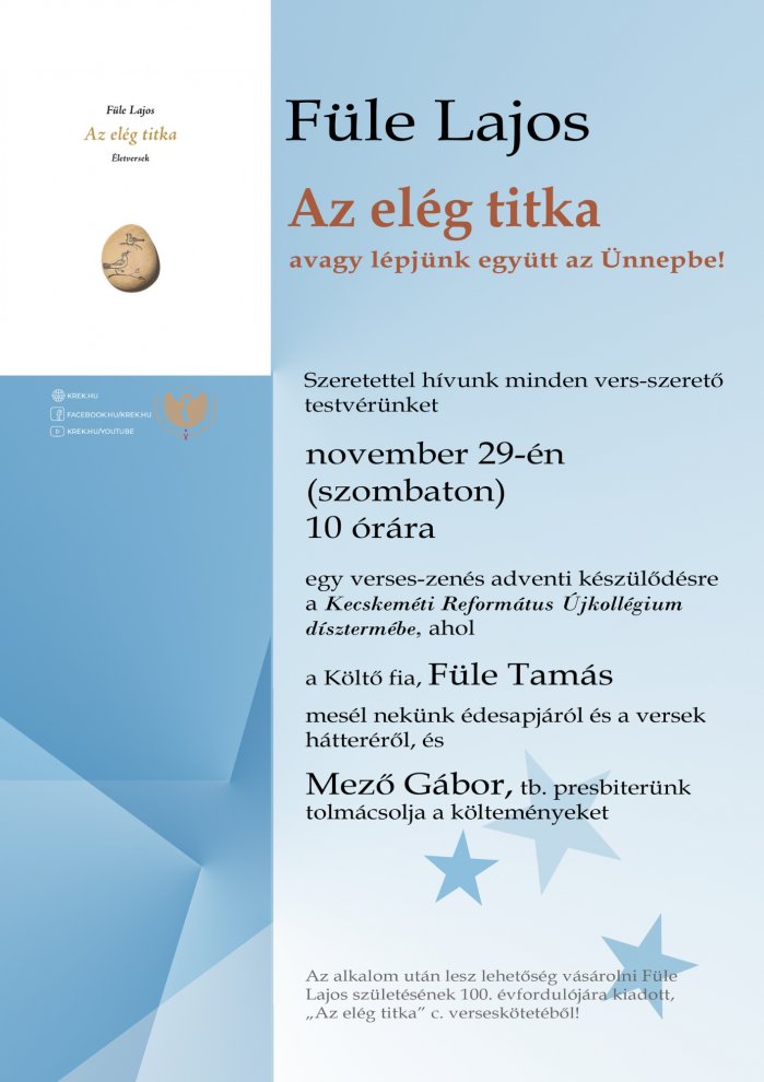 Szeretettel hívunk minden verskedvelőt november 29-én, szombaton 10 órára a Kecskeméti Református Újkollegium dísztermébe egy verses-zenés adventi készülődésre. Az alkalmon a Költő fia, Füle Tamás mesél édesapjáról, és Mező Gábor presbiterünk tolmácsolja a verseket; utána megvásárolható a különleges verseskötet is.